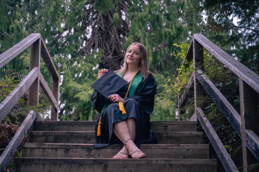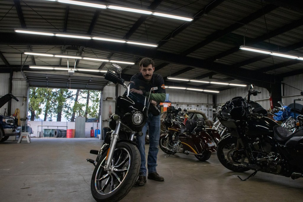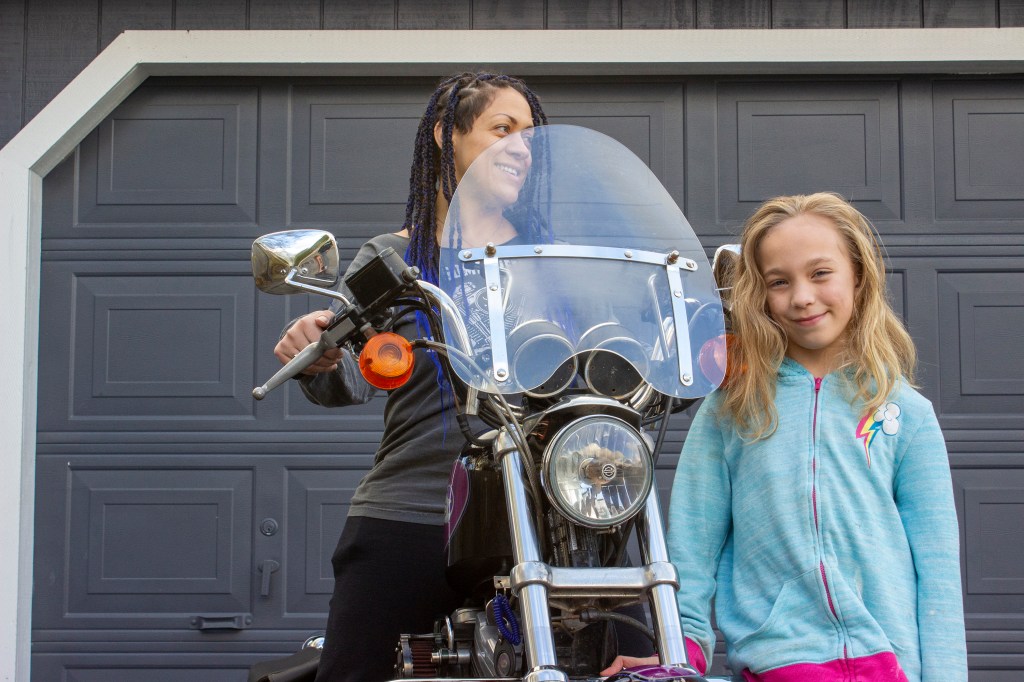 Brook Madison, left, poses on her 1995 Harley-Davidson Sportster 1200, while her daughter, Eva Madison, right, rests on the engine guard outside their McKinleyvile, CA home on April 3, 2023. Photo by Savana Robinson.